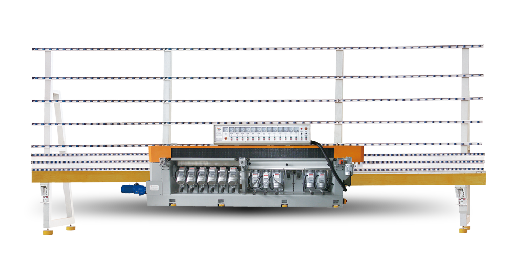 該機器主要用于平板玻璃底邊及大棱邊的磨削,其中磨頭分布及其合理,當中有5個磨削底邊,6個磨削45°大棱邊,能精確地一次過磨出玻璃的平底邊及大棱邊,本機具有實用性強,操作簡便,使用成本低等優(yōu)點。